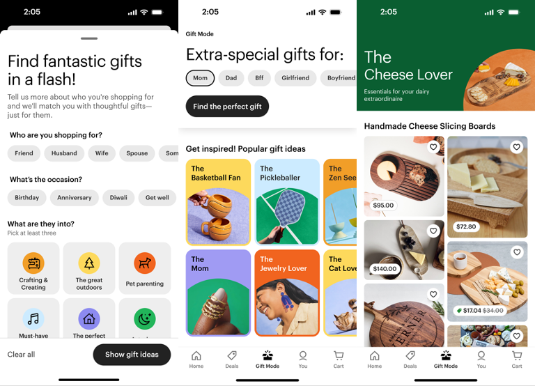 Вище ми описали кілька прикладів використання AI, які можна впровадити у більшість інтернет-магазинів. Втім, радимо спробувати знайти і персональні, унікальні для вашого бізнесу кейси. Наприклад, у Etsy є спеціальний сервіс Gift Mode — це AI-функція на сайті Etsy, яка допомагає швидко підібрати ідеальні подарунки, навіть якщо користувач не знає, що саме шукати. Працює вона як інтерактивний опитувальник: користувач відповідає на кілька простих питань про людину, для якої шукає подарунок, і система створює персоналізовані підбірки ідей.