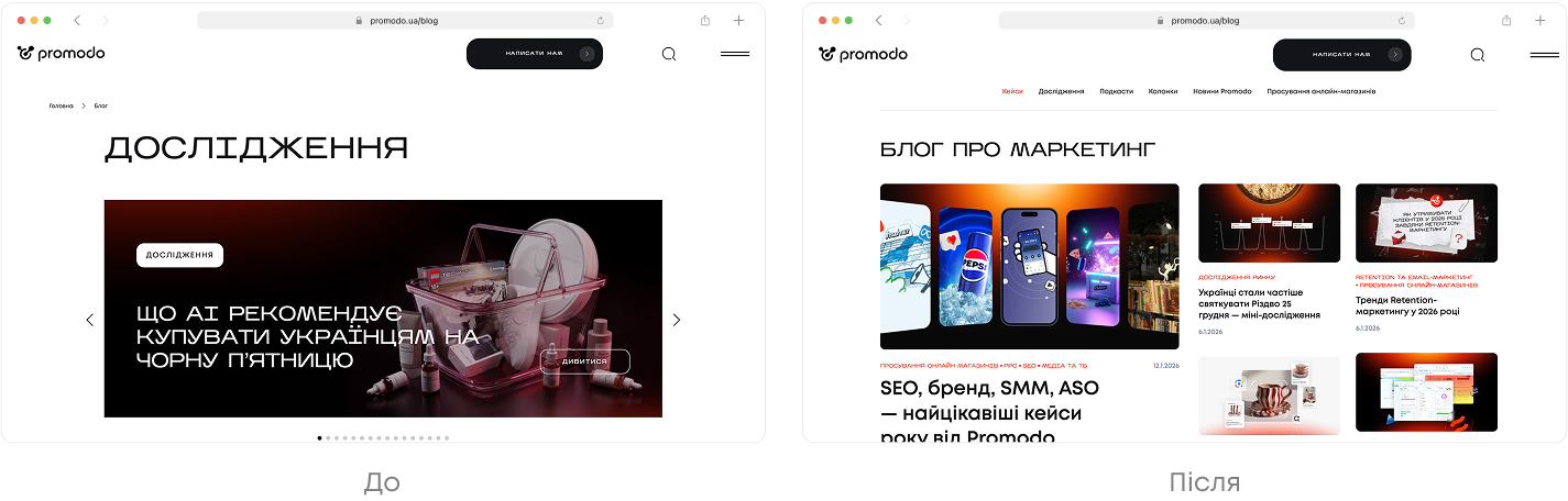 У певний момент ми зрозуміли: старий формат «плитки» нам вже не підходить. Він не дозволяє розкрити всю багатогранність контенту, який створює команда. У Promodo сотні клієнтів, ми багато пишемо про них і створюємо чимало корисних матеріалів для ринку. Потрібно було структурувати все так, щоб читач одразу бачив, яку користь він може отримати.