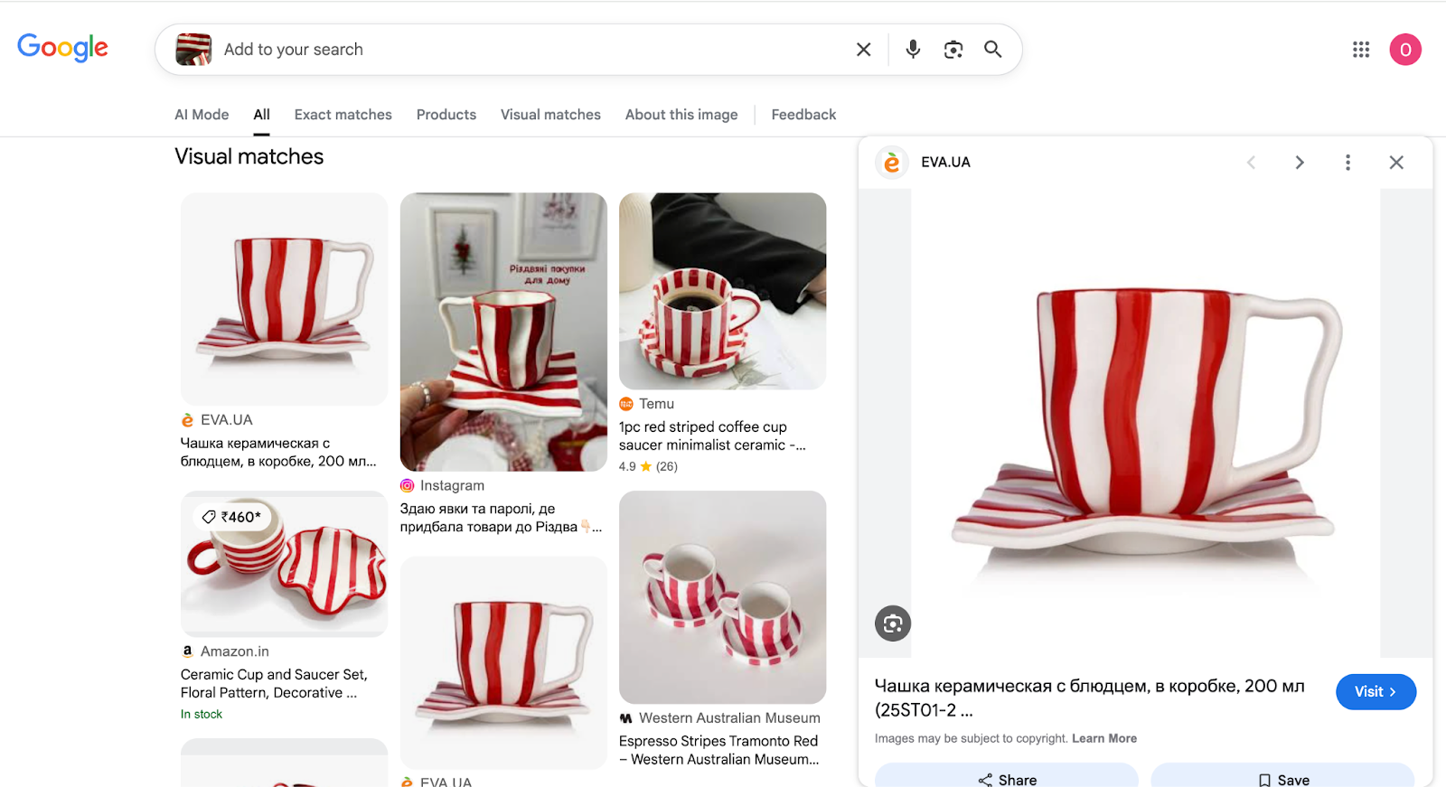 Декілька тижнів тому я гортала стрічку Threads і натрапила на пост із різдвяним горнятком, яке сильно сподобалось. Я зробила скріншот, відкрила Google Lens й завантажила зображення. Уже за кілька хвилин — оформлене замовлення на сайті EVA, а наступного дня я п’ю каву з цієї чашки.