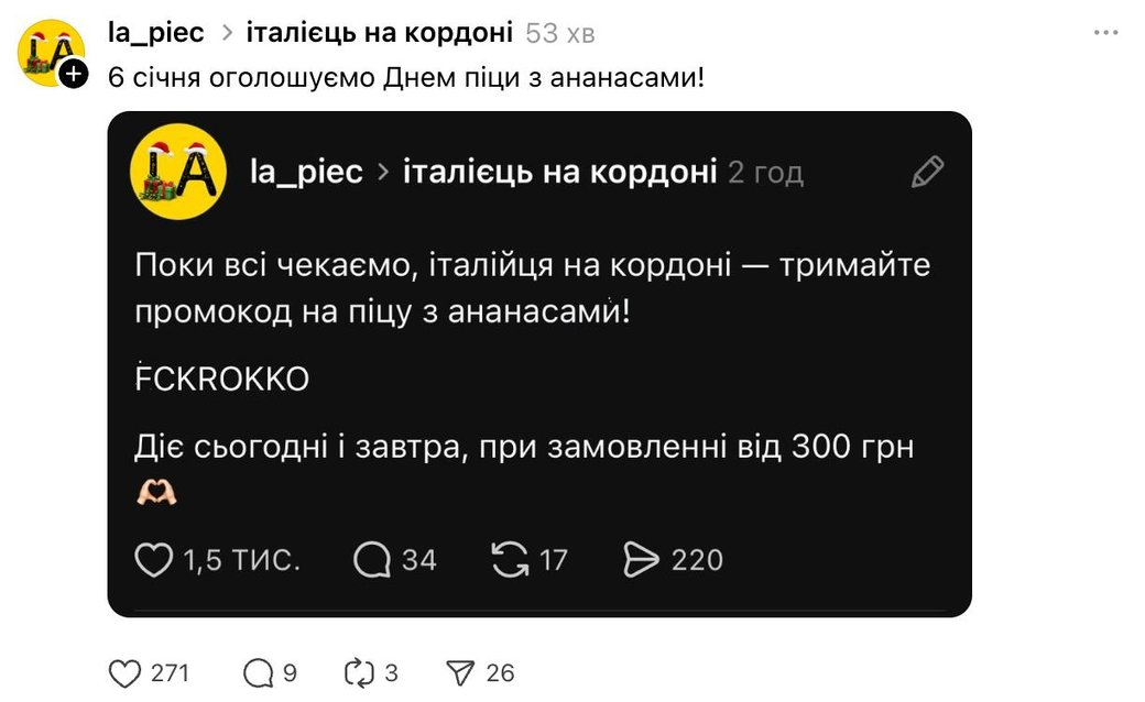 Бренди швидко підхопили контекст: monobank створив тематичний скін для цифрових карток, а мережа піцерій «Ла П’єц» запустила промокод на піцу з ананасами (жартівливу відсилку до італійських кулінарних суперечок).