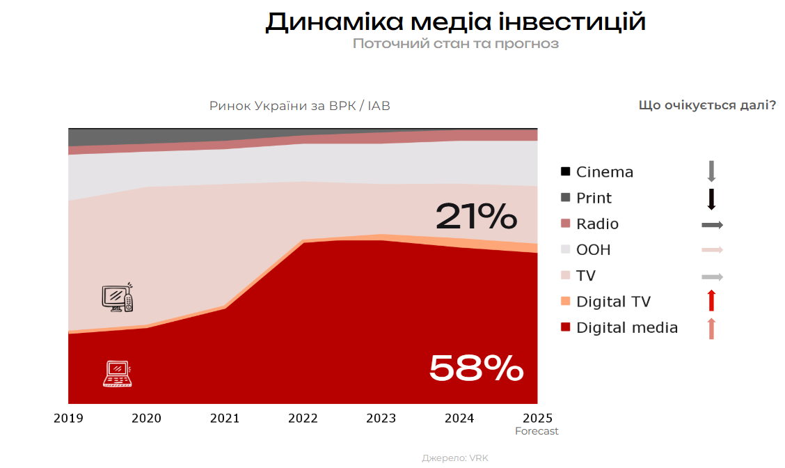 За останні три роки ринок зазнав помітних змін. За даними Всеукраїнської рекламної коаліції (ВРК), зросла частка інвестицій у digital-формати, зокрема Digital TV та Digital Media. Вони дають бізнесу більше гнучкості в умовах нестабільності та дозволяють швидше ухвалювати рішення.