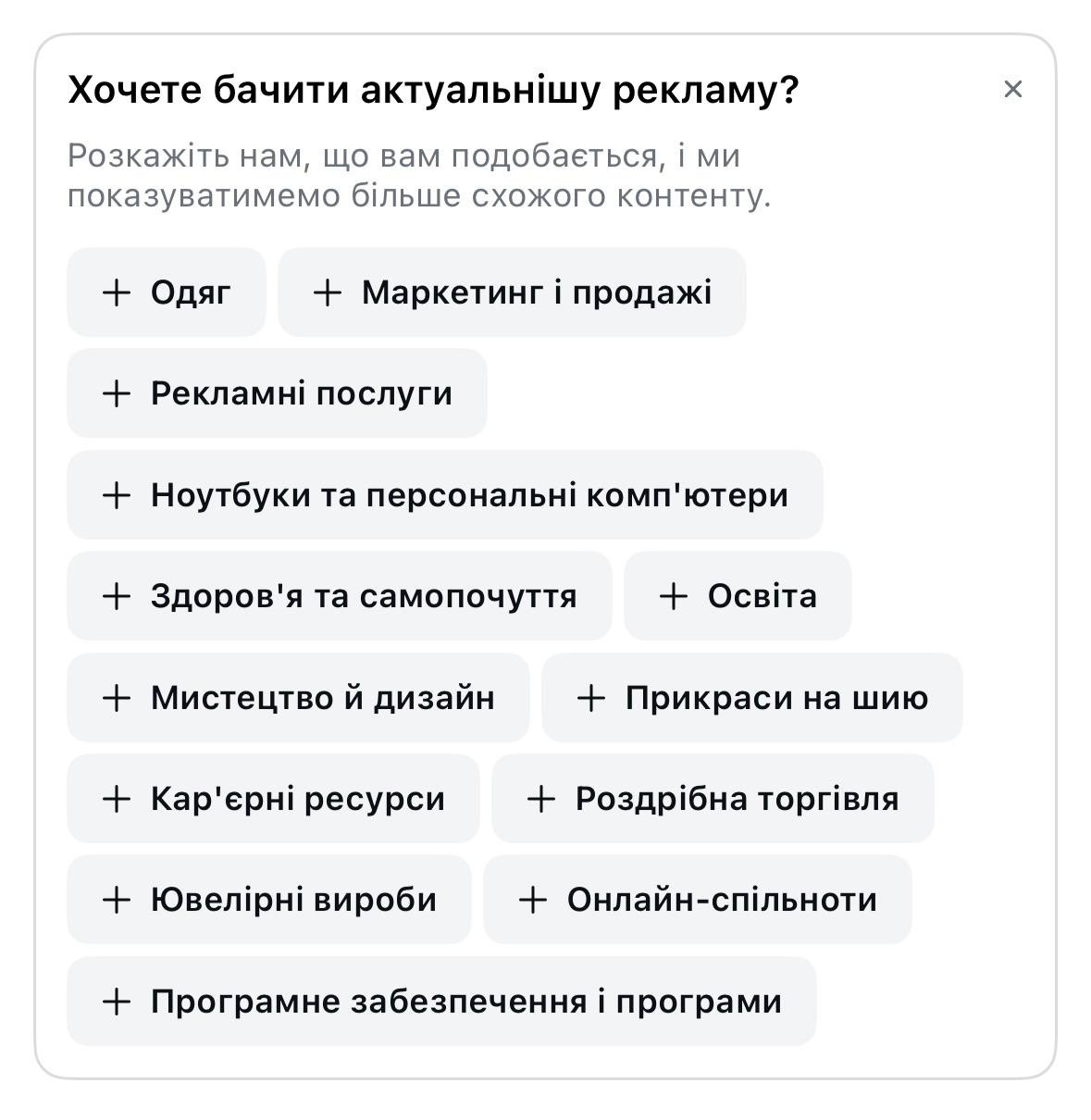 Наприклад, в Instagram у користувачів зʼявляється міні-опитувальник, за допомогою якого вони самостійно можуть обрати, які категорії реклами цікавлять їх найбільше. Ці дані також враховуються як сигнал алгоритмами. Якщо користувач його пропускає, то система вже самостійно збирає дані про рекламу, на яку користувач реагує краще всього.