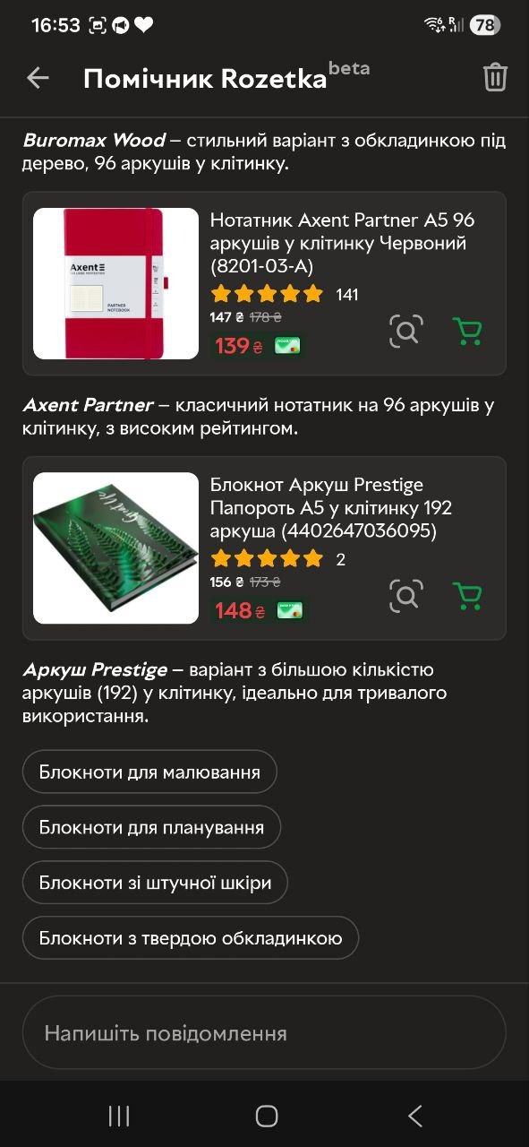 Розетка вже інтегрувала в застосунок AI-помічника. Достатньо написати, що користувач саме шукає, і він одразу підбере найрелевантніші товари. Крім цього, помічник пропонує уточнювальні запити, щоб швидше звузити вибір і знайти саме те, що потрібно.