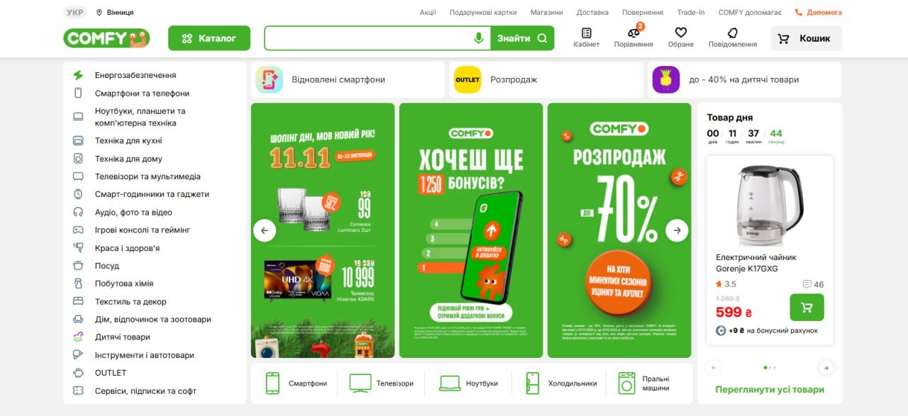 Таке розміщення елементів допомагає візуально структурувати великий обсяг даних і створює динамічний ритм на сторінці. На сайті Comfy цей UX/UI тренд помітний у головному банері: різні промо-блоки з акціями, товарами та бонусами утворюють чітку, але різноманітну сітку, де користувач легко орієнтується у пропозиціях.