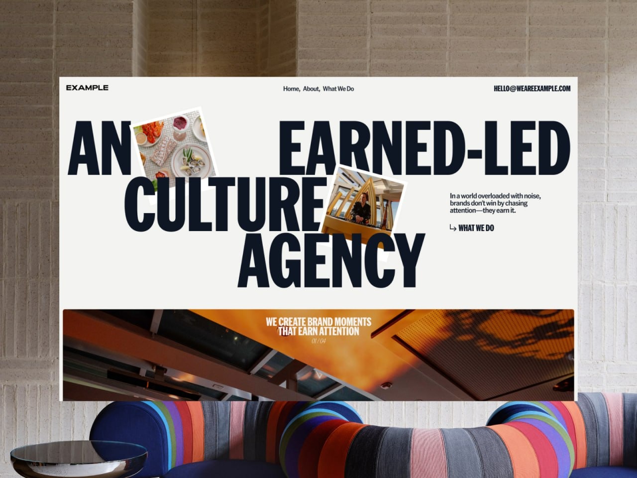 Сучасні сайти дедалі частіше інтегрують текст у композицію із зображенням. На сайті агенції Example цей тренд реалізовано через великі заголовки, що взаємодіють із фотографіями — текст частково перекриває або обрамлює зображення. Такий підхід формує динаміку та відчуття “живої” структури, водночас підсилюючи характер бренду.