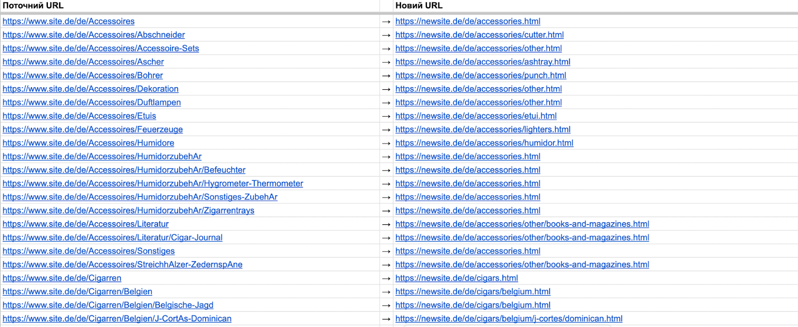 Результатом цього кроку має бути таблиця, що зіставляє поточні URL-адреси з новими. Цей документ потім передається розробникам для налаштування редиректів.