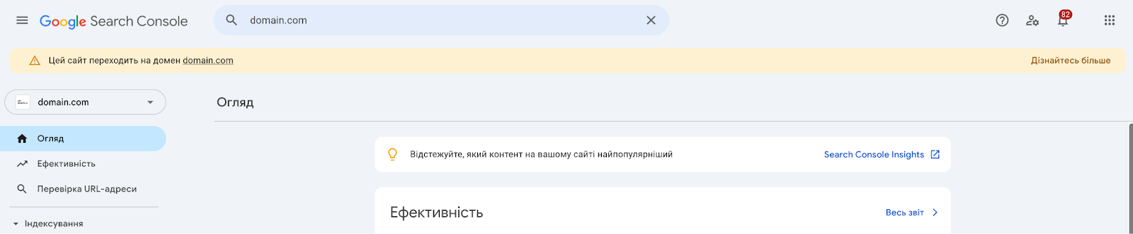 Створіть окремий обліковий запис для нового домену в Google Search Console, а потім повідомте Google про переміщення зі старого облікового запису на новий. Детальні інструкції з налаштування доступні на офіційному довідковому сайті Google.