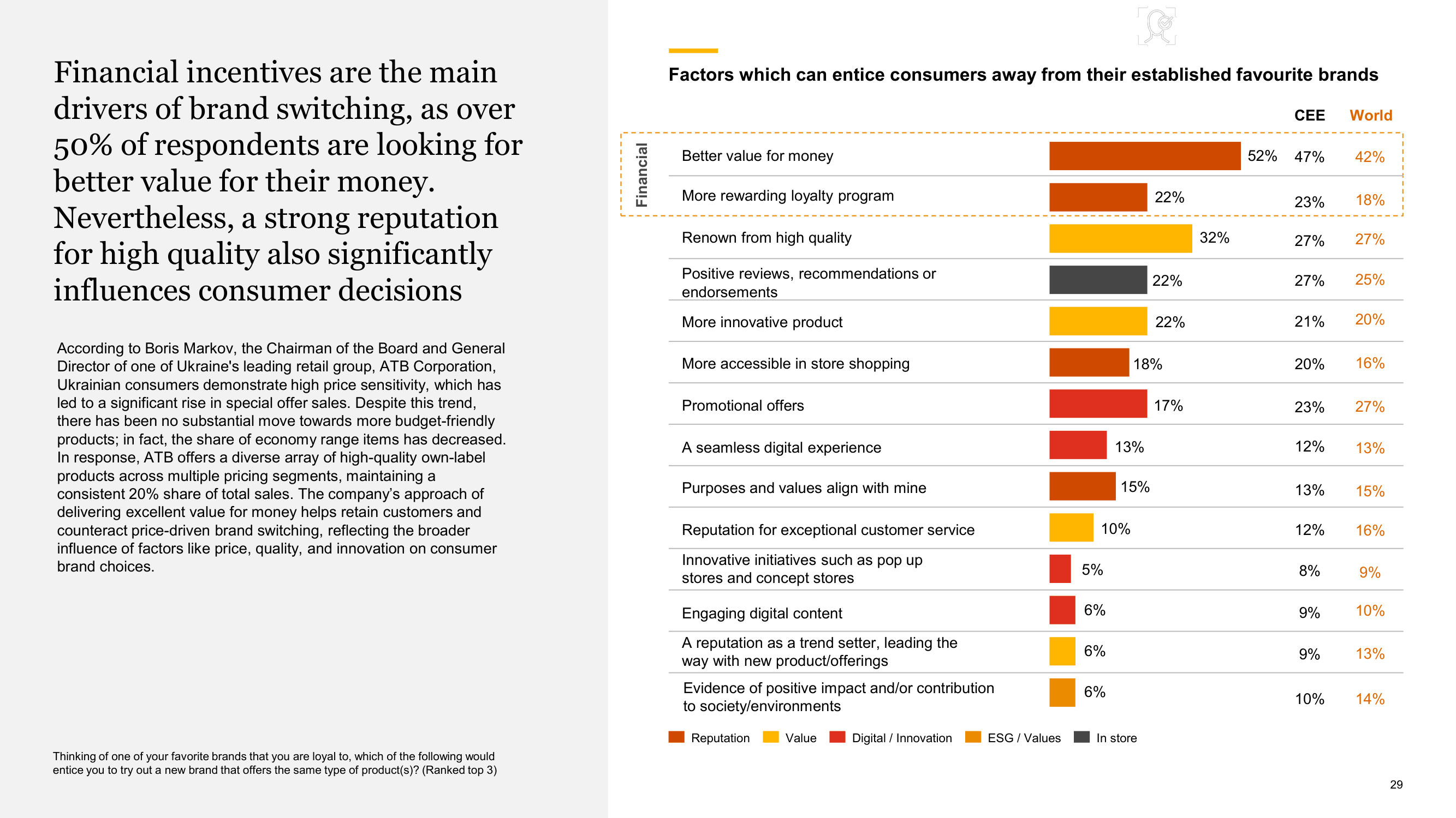 За даними PwC Voice of the Consumer 2024 (Ukraine / CEE), 52% споживачів готові змінити бренд заради кращого співвідношення ціни та цінності. Ціна справді відіграє ключову роль, але є ще інші фактори, які можуть спонукати спробувати новий бренд замість звичного: