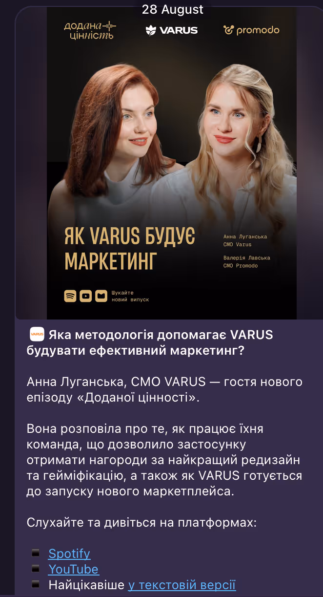Не обов’язково створювати новий контент з нуля — його можна переробляти для різних форматів і платформ. Наприклад, подкаст «Додана цінність» також виходить у текстовій версії у блозі Promodo, адже деяким людям легше прочитати коротку версію з основними тезами. А ще це додатковий трафік та довіру до сайту.