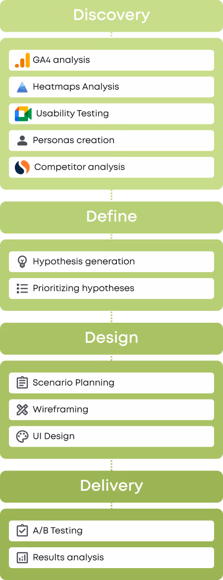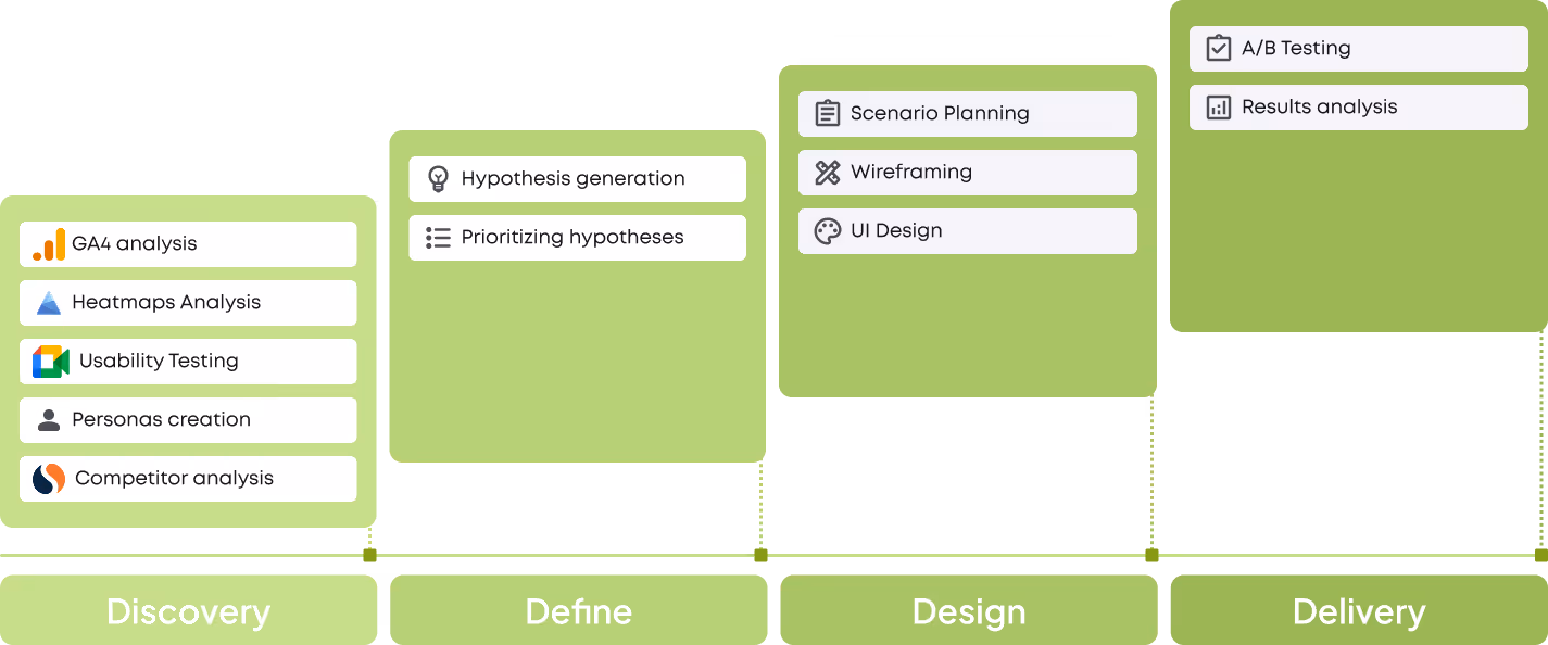 Наш процес починався з повного занурення у досвід користувачів: ми аналізували дані в Google Analytics 4 та вивчали теплові карти в Clarity, щоб знайти точки відтоку. Потім, через юзабіліті-тести та інтерв'ю, ми з'ясовували причини цих проблем.