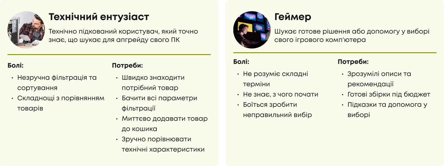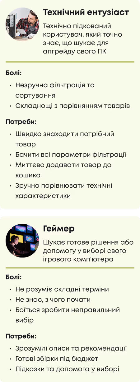 На основі даних з GA4, аналізу теплових карт та живого спілкування з користувачами ми синтезували два ключові архетипи, які представляють основні сегменти нашої аудиторії. Ці персони допомогли нам тримати фокус на реальних потребах людей під час розробки гіпотез.