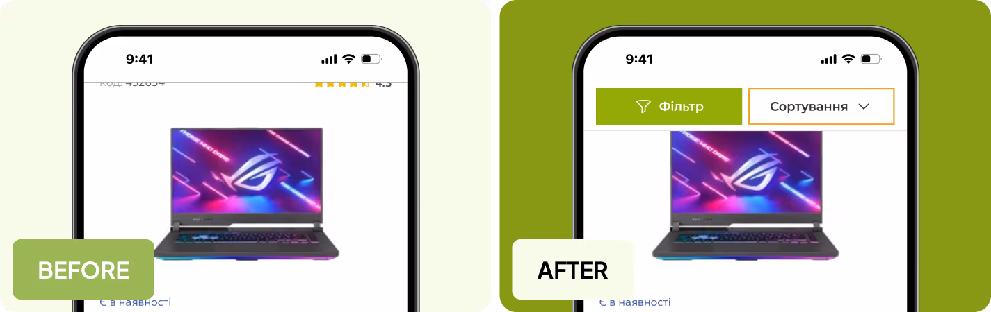 Додавання фіксованої фільтрації при скролі сторінки та сортування збільшать Product Page View та Add to Cart Rate зі сторінки лістингу.