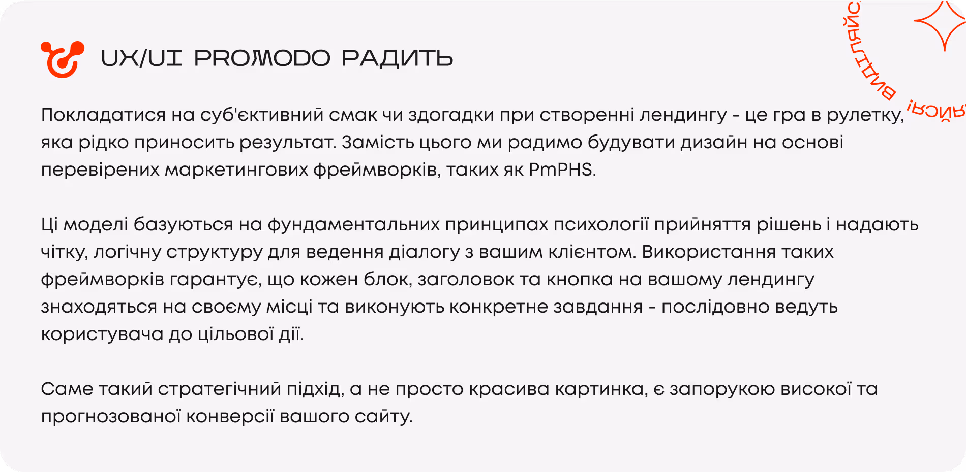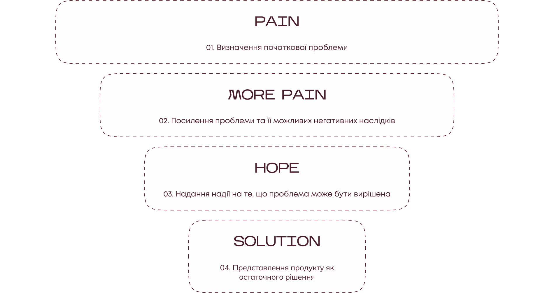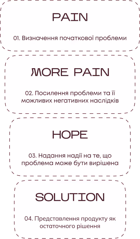 Фреймворк PmPHS — це маркетингова модель для побудови тексту (наприклад, для лендингу), яка впливає на емоції клієнта, ведучи його від проблеми до покупки.