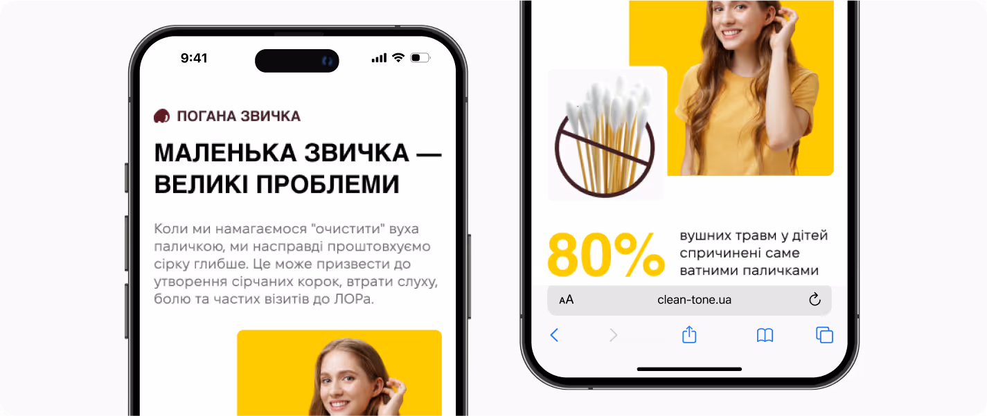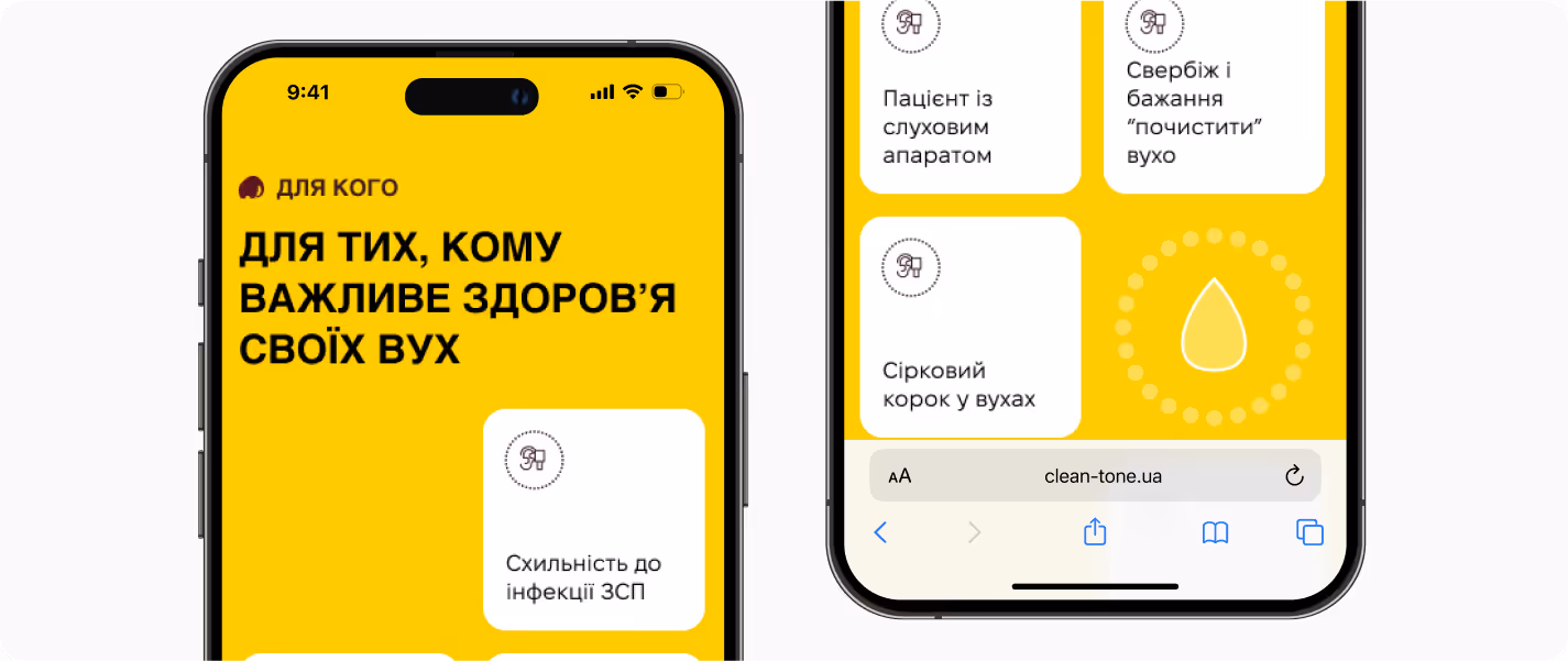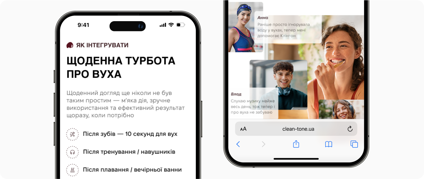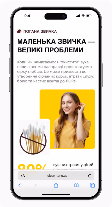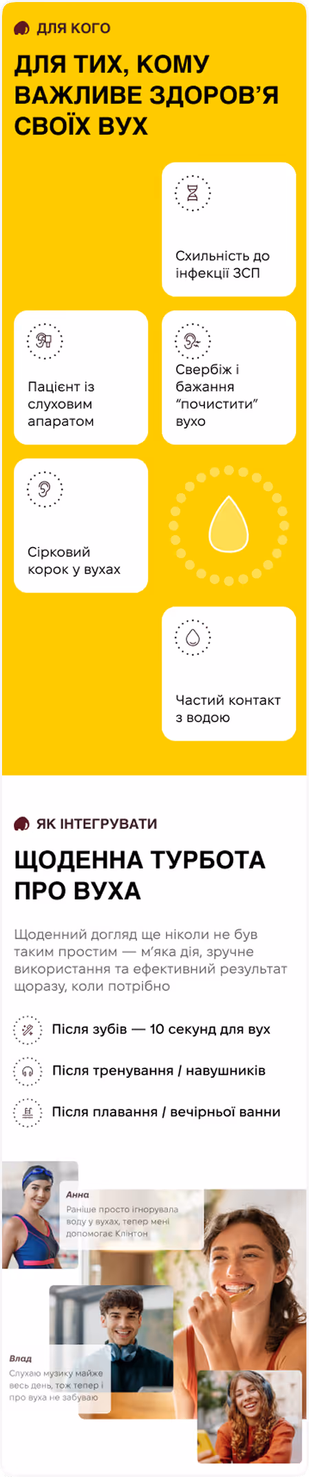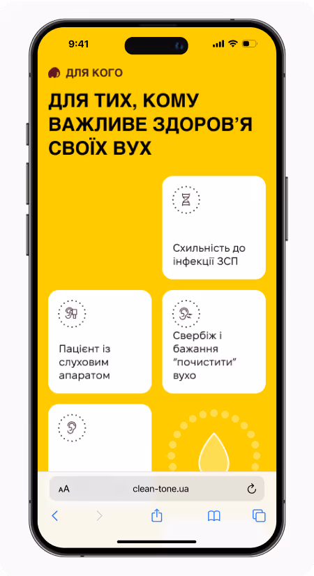 Цей блок допомагає користувачу зрозуміти, що продукт створений саме для нього. Ми показуємо, для кого призначений спрей CleanTone — людей, які піклуються про безпечний догляд за вухами і хочуть прості та ефективні рішення.