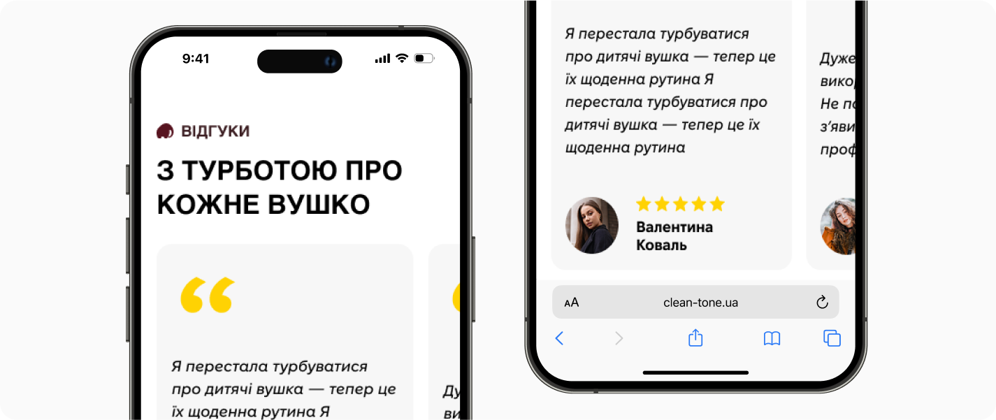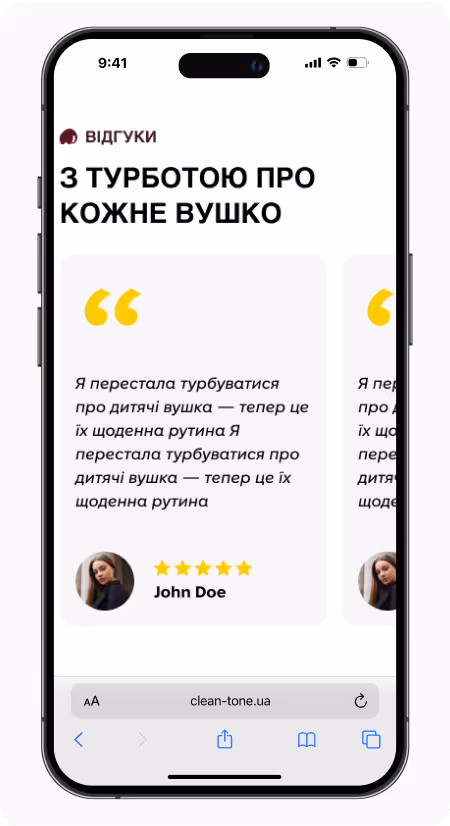Блок створює емоційний зв’язок з користувачем і підвищує його бажання скористатися продуктом. Ми показуємо відгуки реальних користувачів спрею CleanTone, які вже оцінили його ефективність та безпечність.