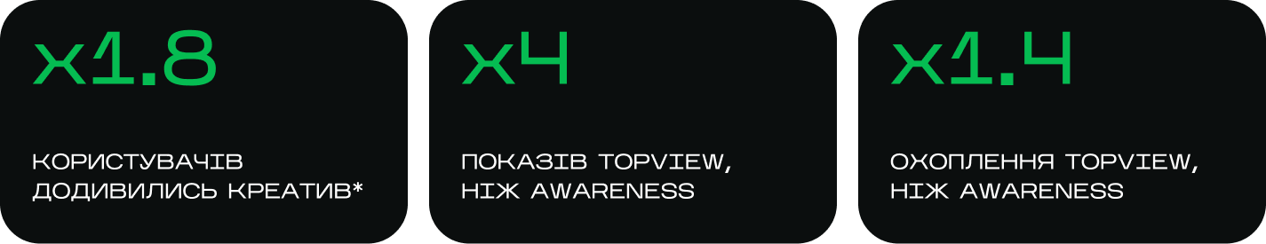 Для України TopView дає можливість гнучко обирати тривалість показів — від певного періоду протягом дня до повного дня. Для ROZETKA налаштували активність на цілий день, щоб максимально використати потенціал формату та забезпечити найбільший контакт із аудиторією.