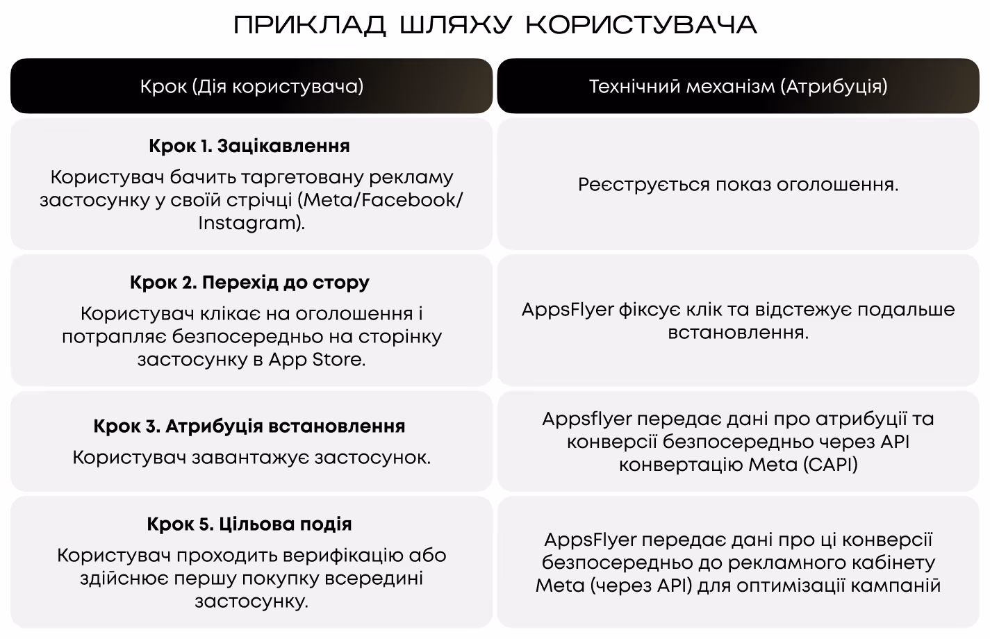 - Майже 100% прозора атрибуція — від кліку до подій у застосунку.