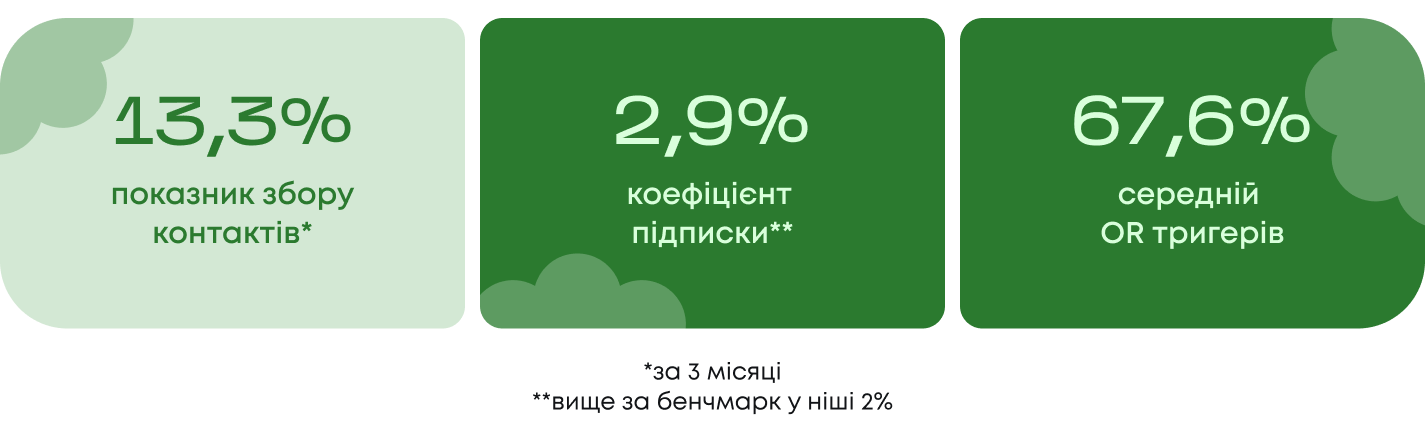 Попри запуск Retention-каналу з нуля, показник збору контактів перевищив прогнозований рівень на 13,3%. Цей результат суттєво перевершує галузевий бенчмарк (2%).