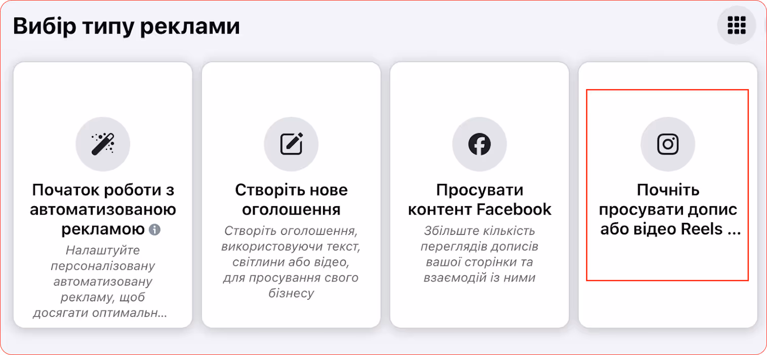 Такий метод відкриває додаткову опцію вибору цілі, яка недоступна у стандартному рекламному акаунті — «Максимальна кількість відвідувань профілю». Іншими словами, лише натиснувши кнопку «Просувати» під конкретним постом, можна отримати ціль, якої немає серед налаштувань у кабінеті.