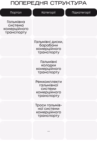 Крім того, сайт не мав функціоналу для масової оптимізації сторінок категорій і фільтрів — зокрема автоматичного завантаження метаданих, текстів та тегу robots. Тобто через відсутність автоматизації, робота з тисячами сторінок категорій і фільтрів відбувалась вручну. Як наслідок, SEO-зміни впроваджуються повільно, що напряму обмежувало індексацію та знижувало видимість сайту за пошуковими запитами.
