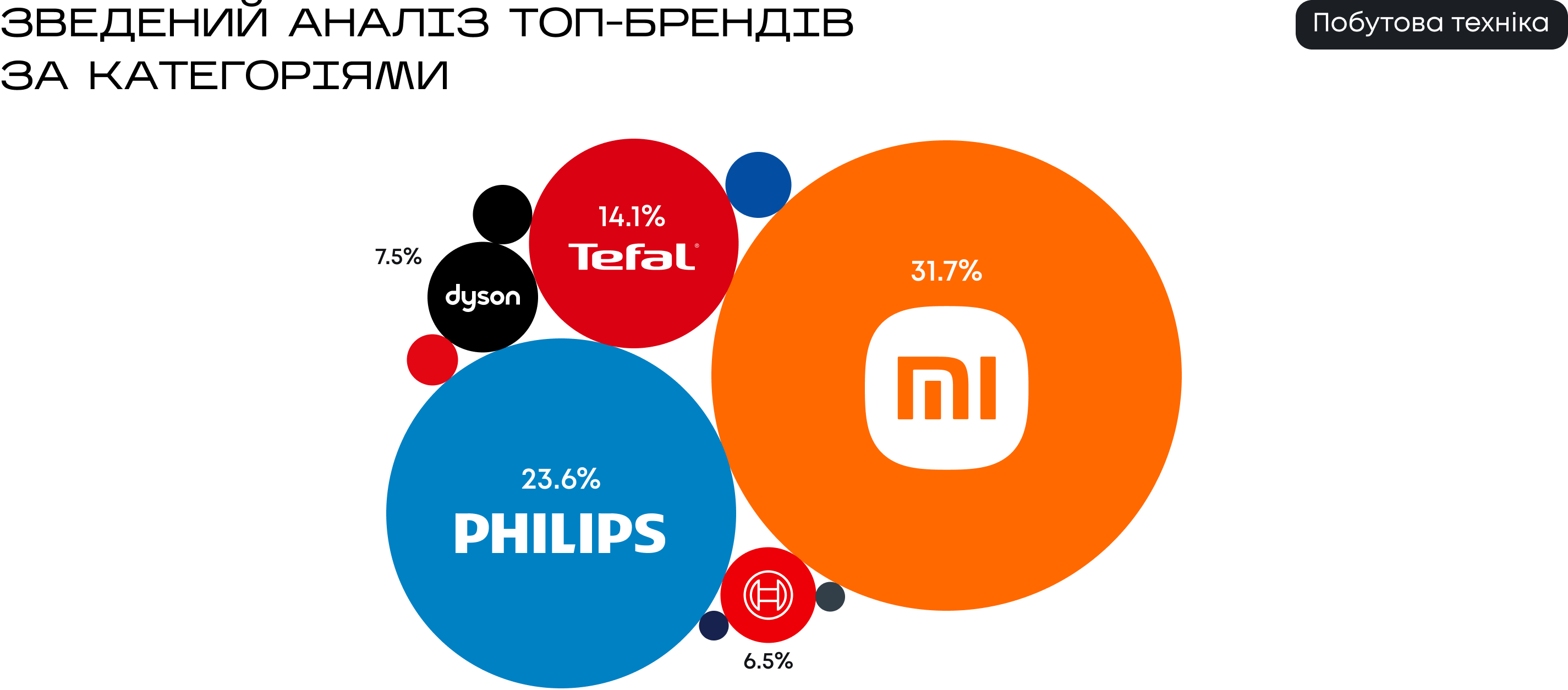 У категорії побутової техніки лідирують згадки двох брендів — Xiaomi (29%) та Philips (28%), який потрапив в рекомендації через репутацію надійності. За ними йдуть Tefal (20%), Dreame та Bosch (10%), а от популярний бренд пилососів та фенів Dyson потрапив лише в рекомендації від Perplexity.